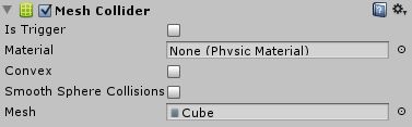 ※Mesh Collider同士は通常では衝突しませんが、Convexをオンにした場合のみ衝突することが出来ます。良くある方法として、動く全てのオブジェクトにはプリミティブなコライダを組み合わせ、動かない背景のオブジェクトにMesh Colliderを使います。